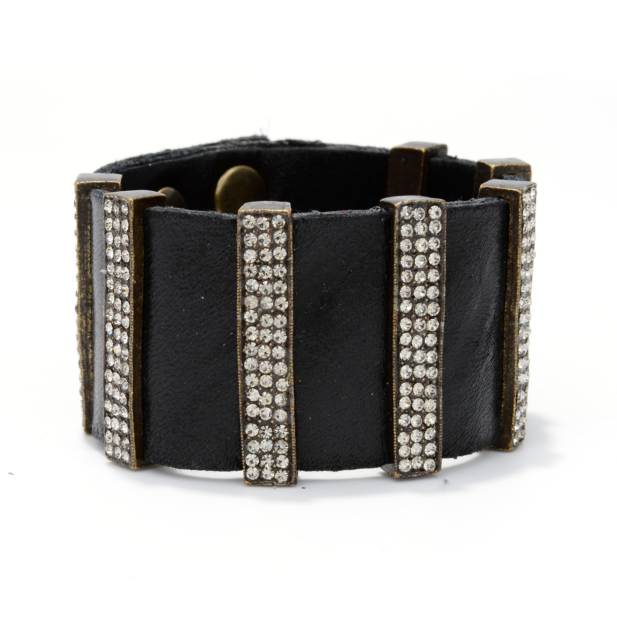 Rebel Designs pave crystal bars and leather bracelet. Antique brass finish with black diamond crystals and genuine Italian leather. Handcrafted in Brooklyn. Style #5135.