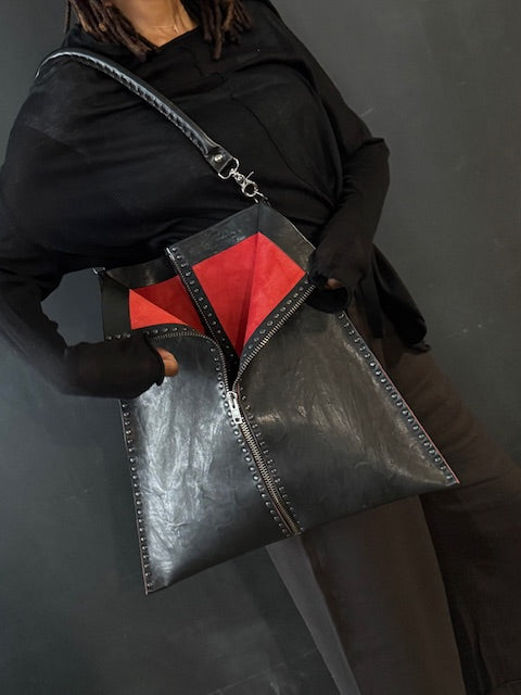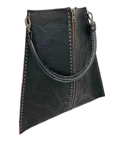 Carry your essentials in style with this handcrafted zipper tote, made right here in Brooklyn. Constructed from genuine Italian leather and lined with sumptuous suede, it's built to last and feel amazing. Two interior pockets keep your stuff organized, while the sturdy tube shoulder strap handles the load with ease. Hand-set brass studs add just the right amount of edge and personality. This isn't just a bag—it's a statement piece that proves good design never goes out of style. 17" base x 17" deep, 12" top opening. Style #47B.