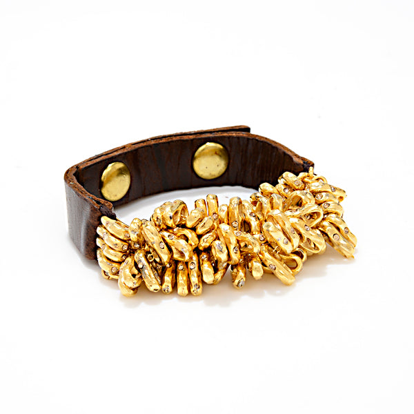 Rebel metal cluster with crystals leather bracelet. 18K gold finish with black diamond crystals. Genuine Italian vintage leather. Adjustable snap closure. Handmade in New York. Style #RR1015.
